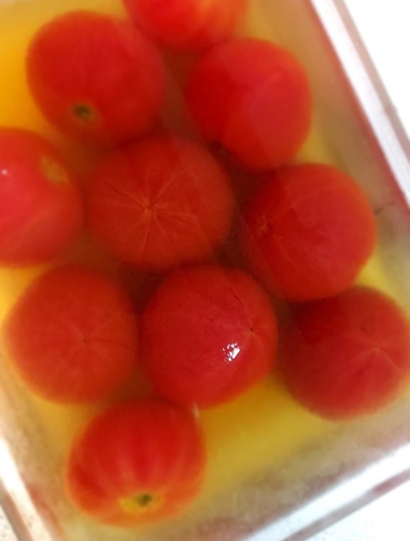小ぶりで固めなトマトを湯剥きしてお出しに2日間浸したもの