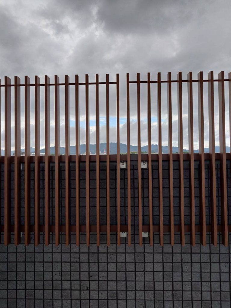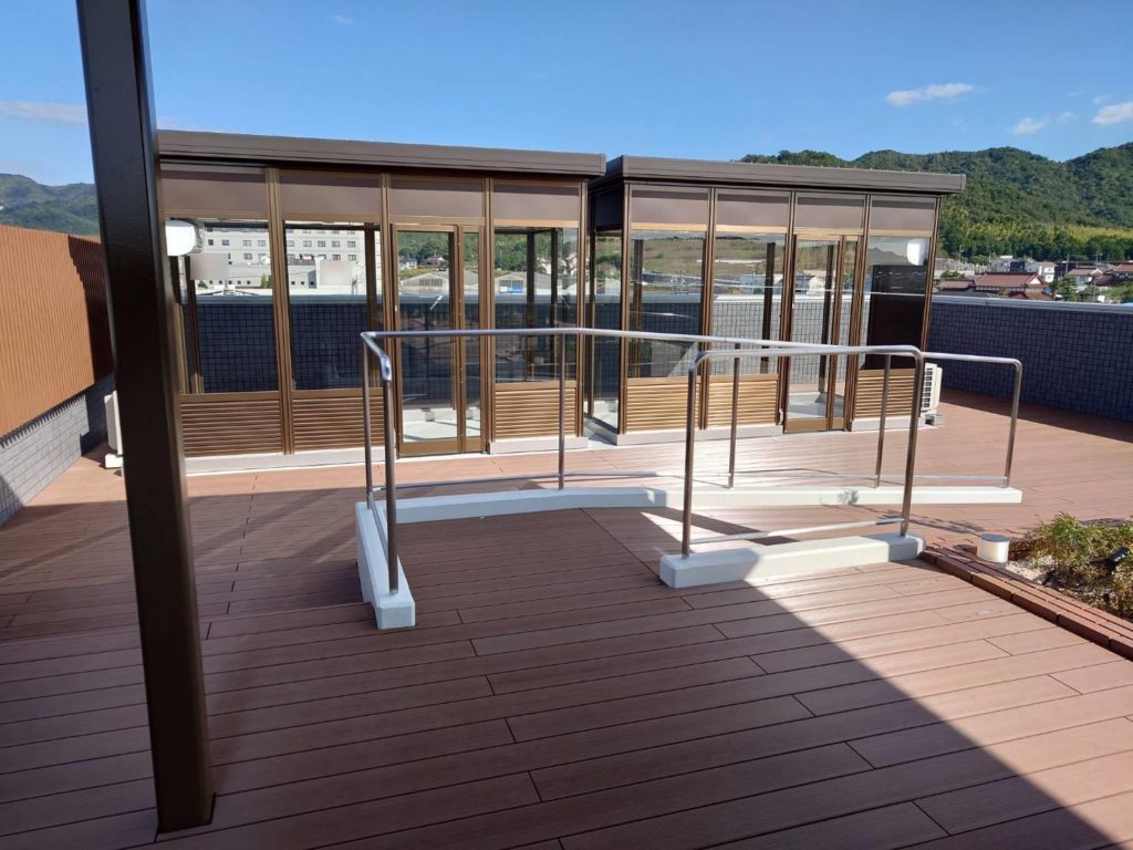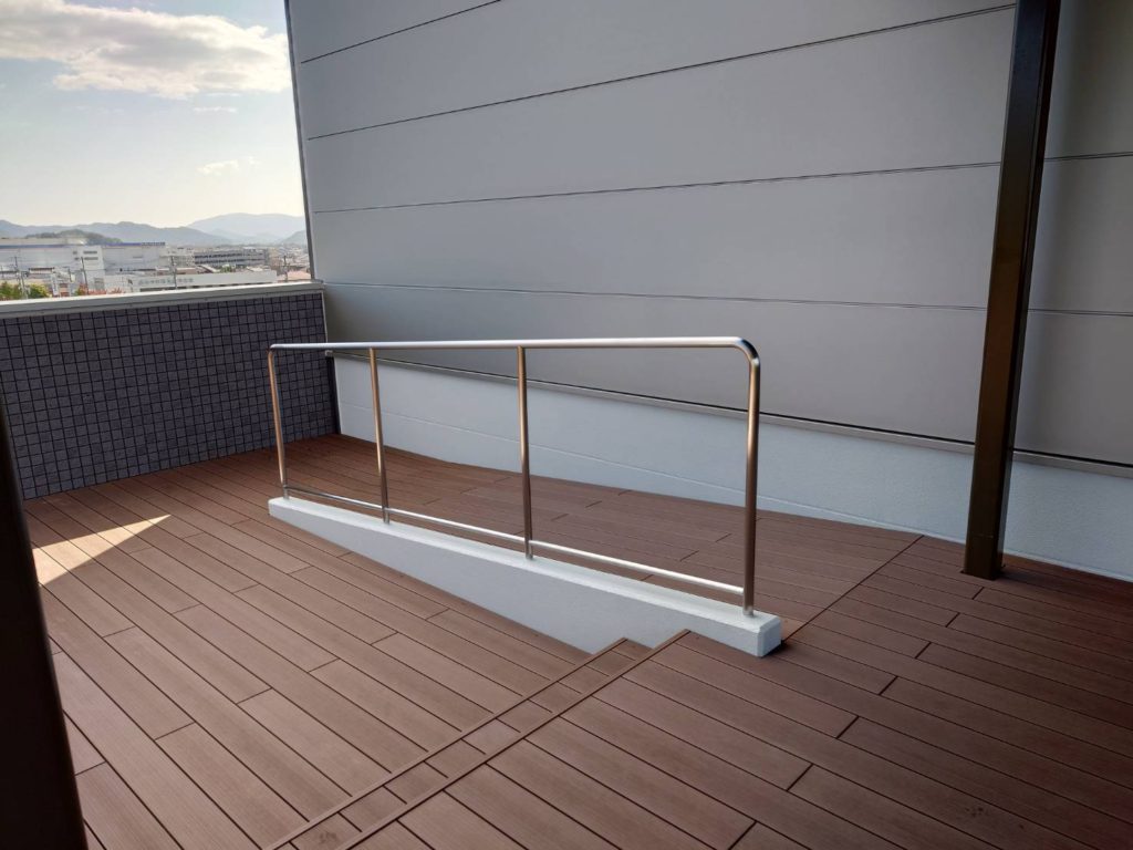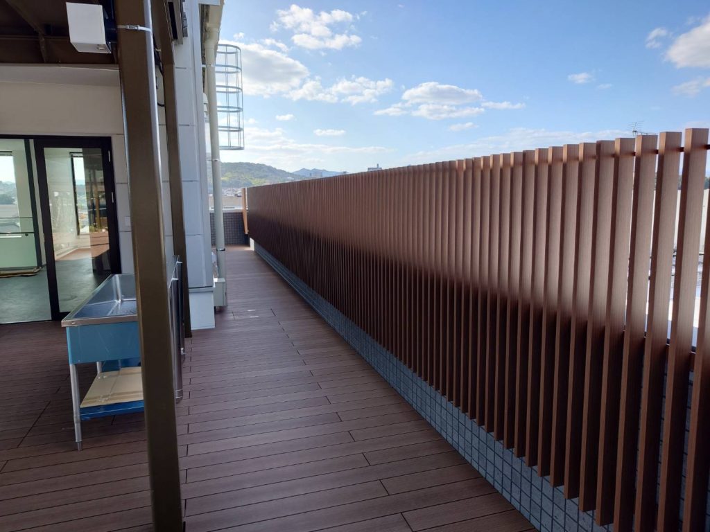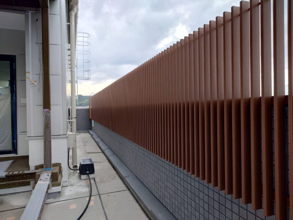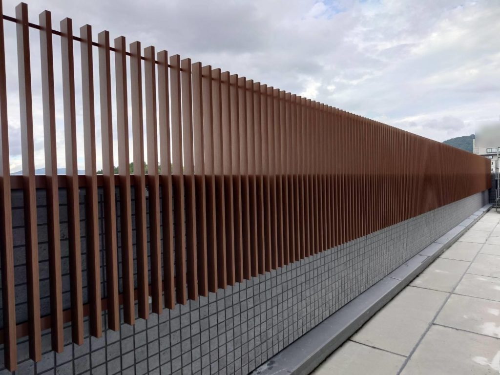広島県東広島市 某本社屋 外部屋上 木目調ルーバー・ステンレス手摺 設置